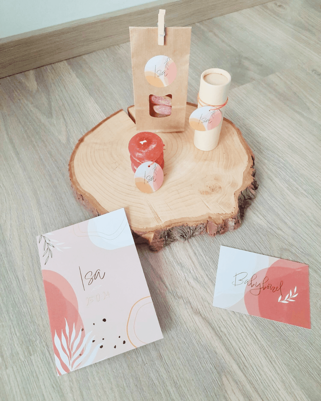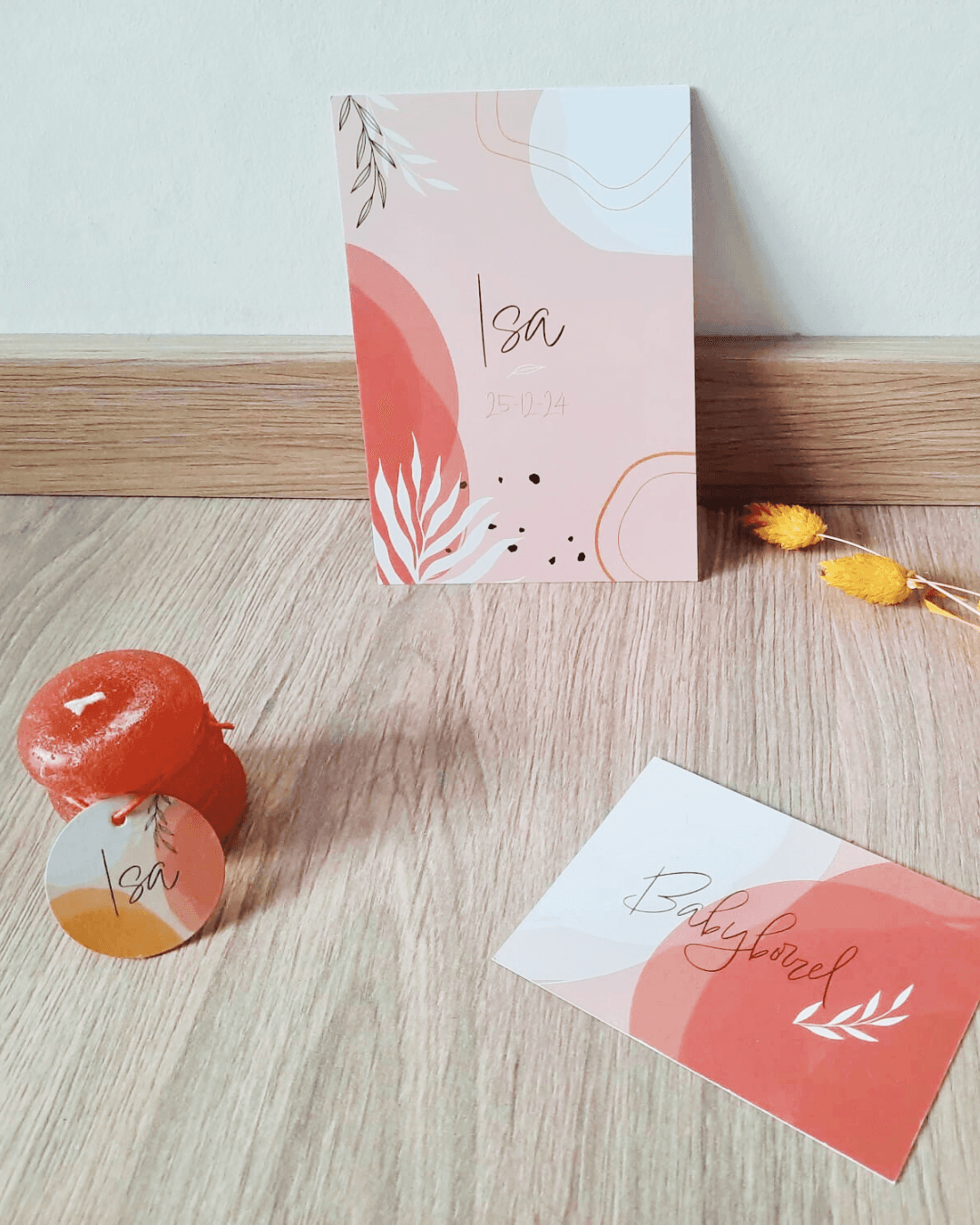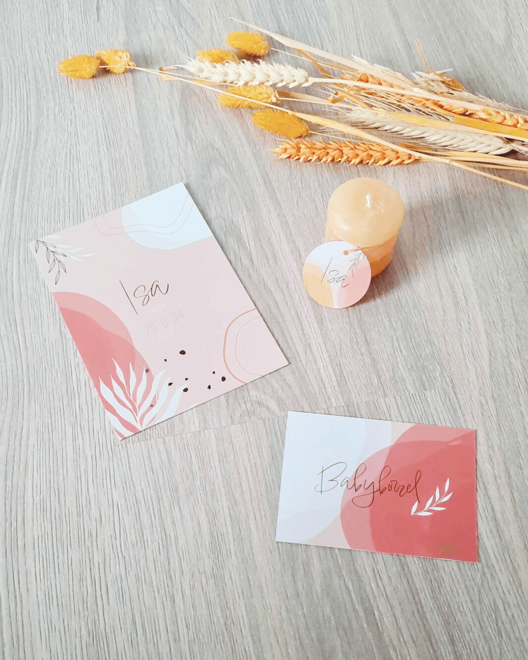 Once the birth announcement was finalised, I extended the design into two additional pieces: a baby shower invitation and a small sticker card to attach to candles or other gifts. All three stayed true to the same visual language, making everything feel like a cohesive set.