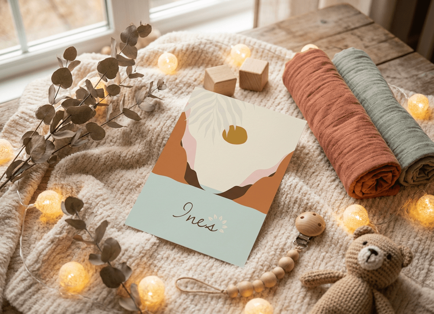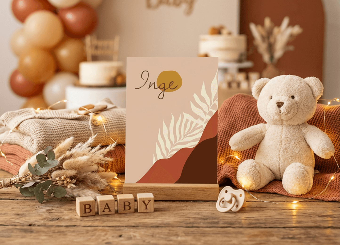 I developed three distinct concepts for the parents to choose from. The chosen direction leaned into a modern boho aesthetic: a warm palette of sand, terracotta, broken white, mustard yellow and deep brown for the typography. Nothing harsh, nothing that fights for attention.