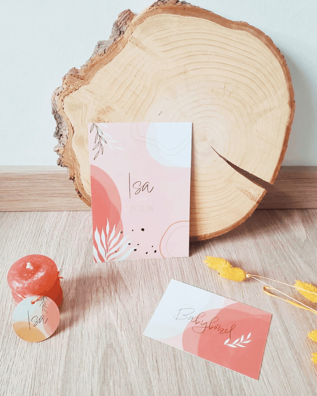 A birth announcement design for baby Isa, created in a modern boho style with warm earth tones and organic shapes. The project included three initial concepts, a final birth announcement, a baby shower invitation and a matching sticker card.